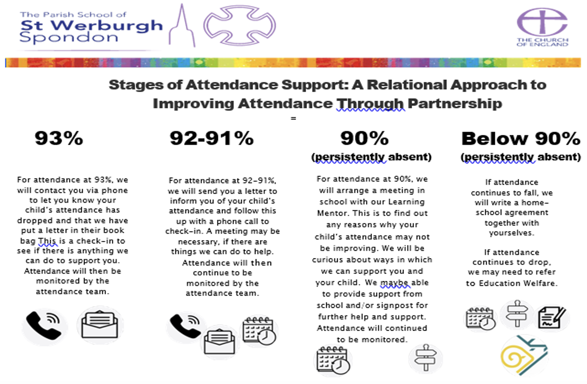 The pupil’s parent/carer must notify the school of the reason for the absence on the first day of an unplanned absence by 9.00am or as soon as possible by contacting the school office by phone on 01332 673827 or by sending an email to admin@stwerburghs.derby.sch.uk.