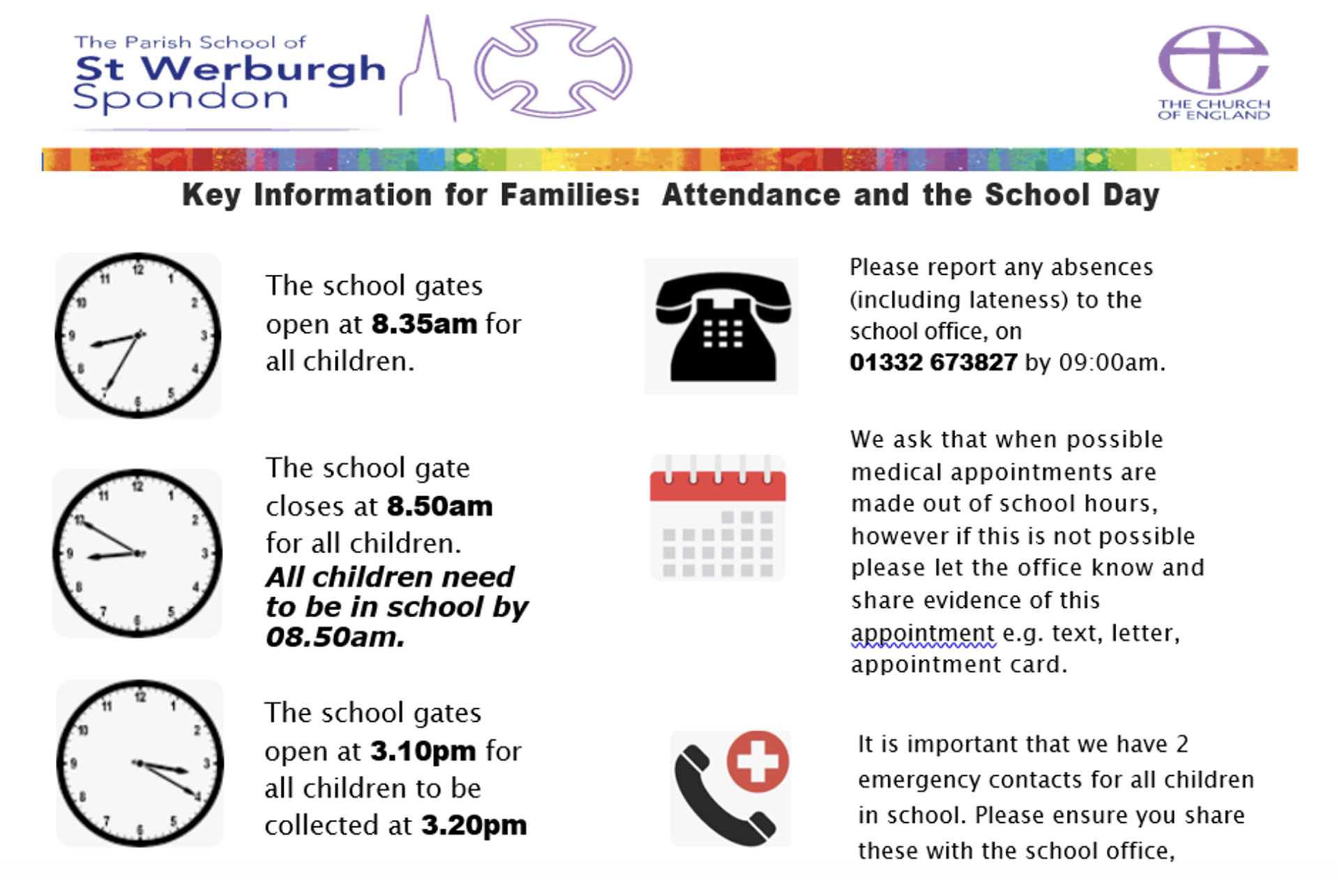 The pupil’s parent/carer must notify the school of the reason for the absence on the first day of an unplanned absence by 9.00am or as soon as possible by contacting the school office by phone on 01332 673827 or by sending an email to admin@stwerburghs.derby.sch.uk.